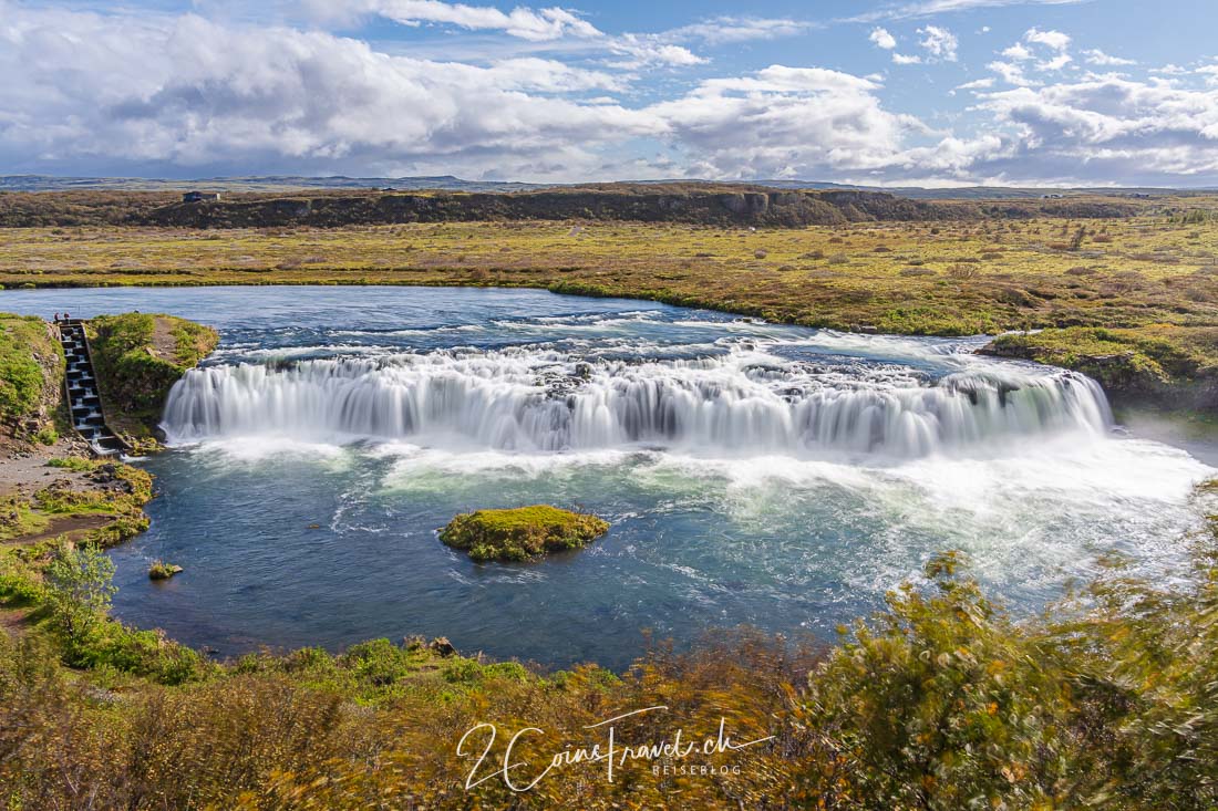Der Selfoss ist ein atemberaubender Wasserfall im Nordosten Islands, der sich majestätisch über eine Breite von etwa 100 Metern in die Tiefe stürzt. Der Selfoss nur wenige Minuten Fussweg vom Dettifoss entfernt.
